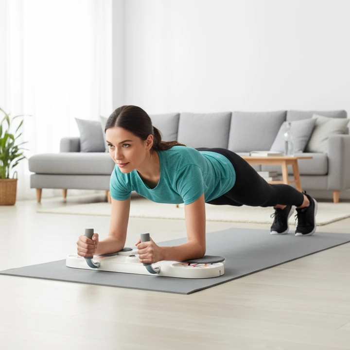 - Plank i brzuch – stabilne oparcie dla dłoni/łokci umożliwia plank statyczny i izometrie.